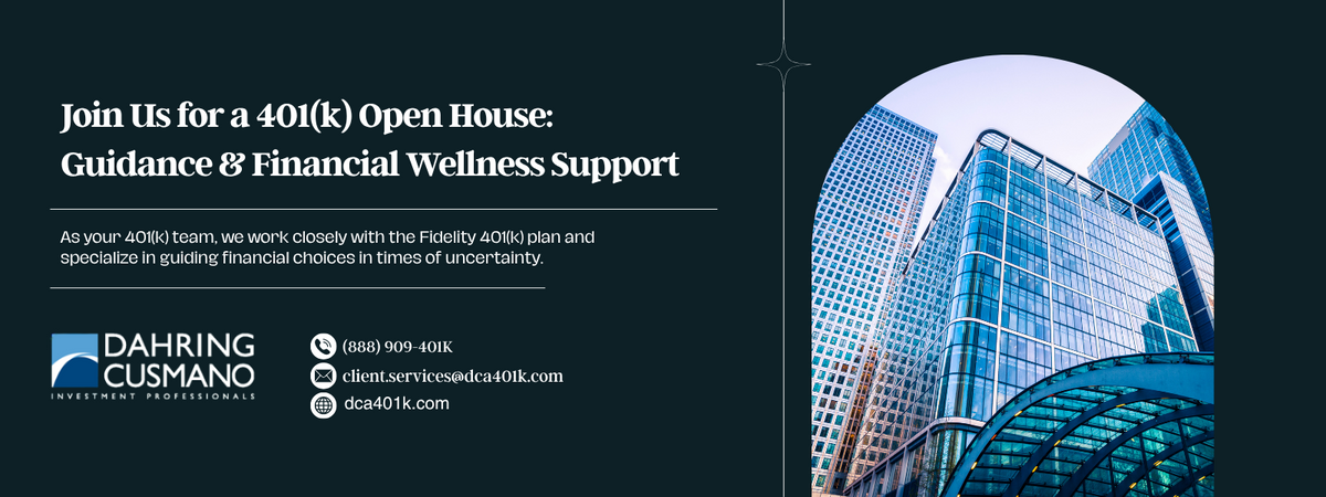You're invited to join Dahring | Cusmano for a relaxed and informative Open House focused on 401(k) Navigation and Financial Wellness. This event is designed to provide you with one-on-one access to trusted advisors who can help you understand your 401(k) options, answer your questions in plain language, and guide you through your next financial steps.